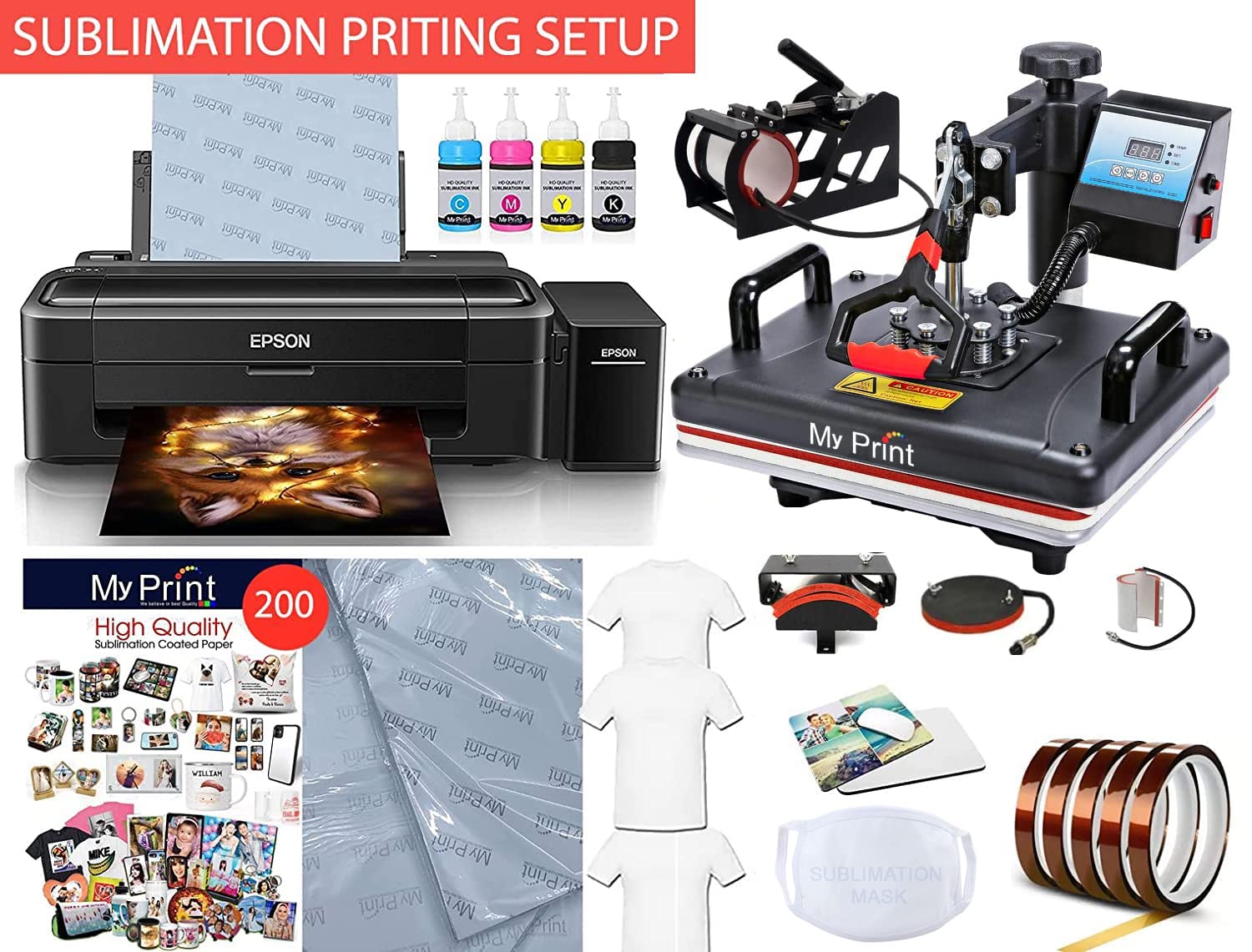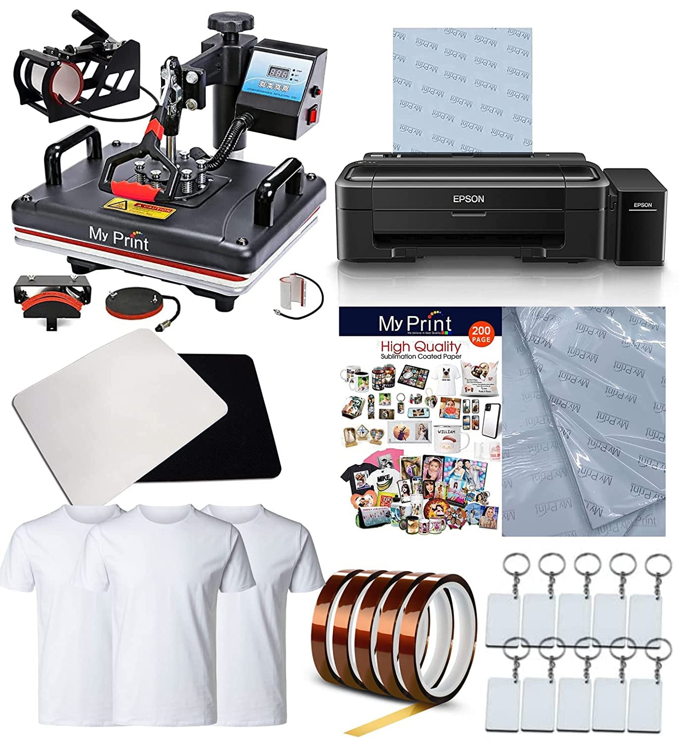 Start your custom printing business with the MY PRINT 5-in-1 Sublimation Combo—includes L130 printer, sublimation ink, 200 papers & heat press for t-shirts, mugs, caps, and more.